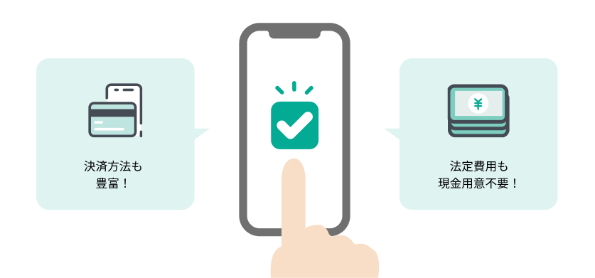 スキマ時間にサクッとお申込みできます。決済方法も豊富で、法定費用も現金のご用意は不要です。